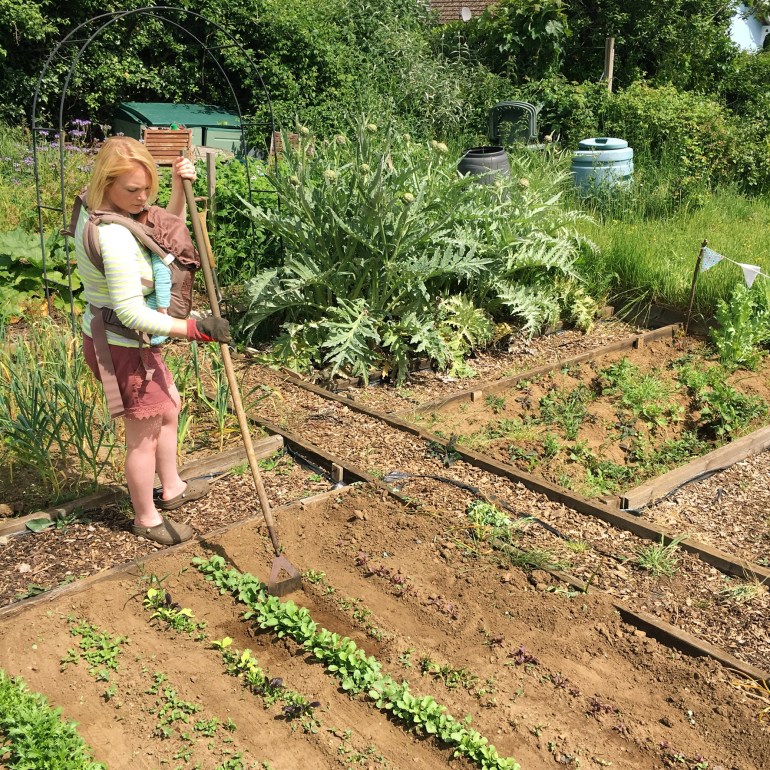 Looking back the best time to get things done was the newborn phase, where I could pop him in a sling and get down to the plot fairly easily. Sure, we’d have to stop to regularly breastfeed, but I got quite skilled at doing jobs while squatting or standing with him attached. Understandably he didn’t like to be bent over, so some of the cabbages were planted with a posture my junior school ballet teacher would have been proud of.